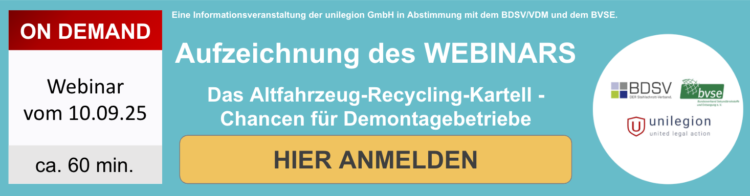 Bereits nach vorläufiger Einschätzung auf Grundlage öffentlicher Marktdaten geht unilegion allerdings davon aus, dass sich die durchschnittliche Nachzahlung für jedes einzelne in den 15 Jahren des Kartellzeitraums verwertete Fahrzeug auf bis zu 100 Euro und mehr belaufen dürfte. Hinzu kommen Zinsen, die sich bereits jetzt (je nachdem, wann innerhalb des Kartellzeitraums das Fahrzeug entsorgt wurde) auf 40% bis 120% (durchschnittlich ca. 80%) der eigentlichen Nachzahlung summieren.
